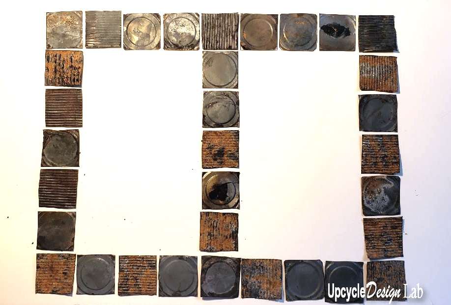 Once the cans were rusted I cut them into 2×2 squares using a cardboard template and some tin snips.
