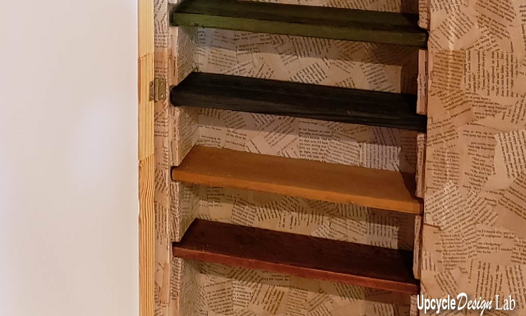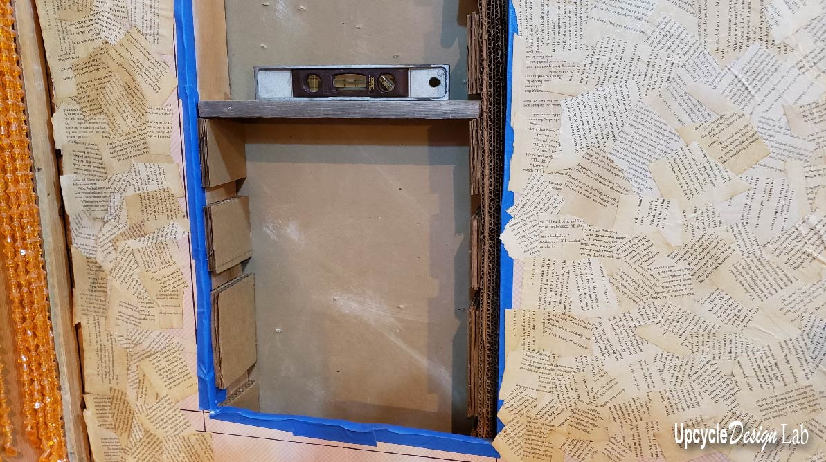 Once the hole was cut in the wall I used some cardboard to make the brackets to hold some shelves that were cut from old fence pieces. I used tape to cover the edges of the drywall and then covered the wall with the book paper and mod podge.