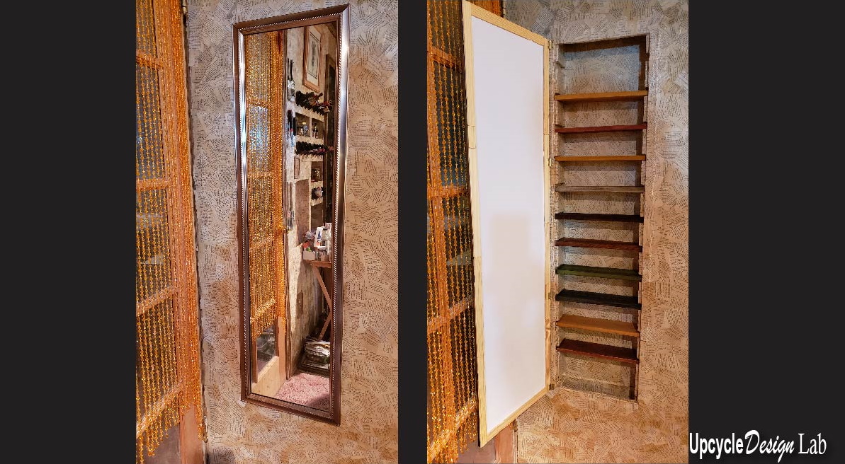 Once the shelves were in place I added a mirror with some hinges to hide the storage space.