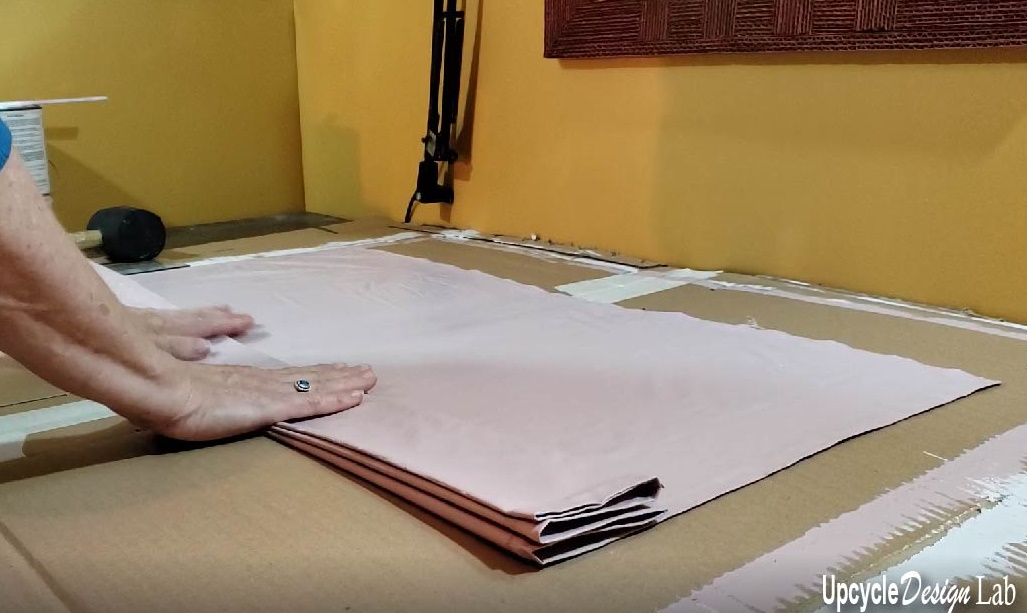 After the paint was dry it was time to fold and glue the sides and bottom edge to the finished dimensions that I needed. Once the edges were glued I added the top coat of color on both sides. When the paint was dry I folded the fabric in a 3-inch wide fan fold.