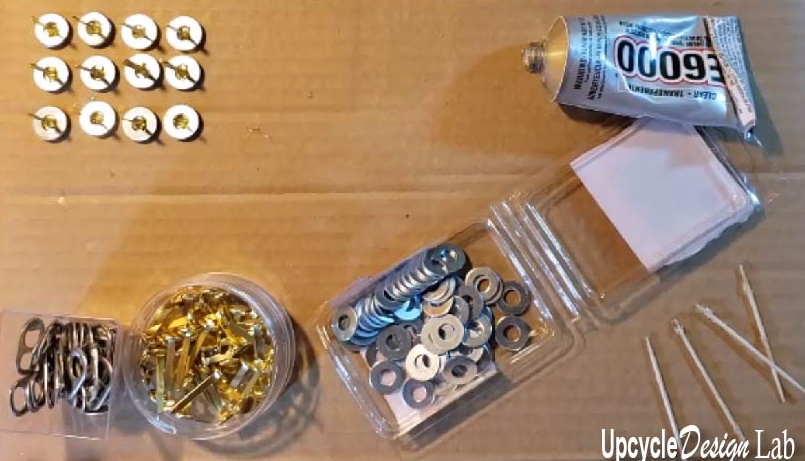 To make the hardware pieces I used some small washers, some brass paper fasteners and some pull tabs from pop cans.