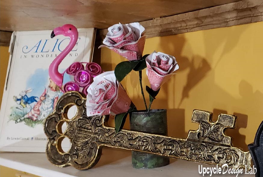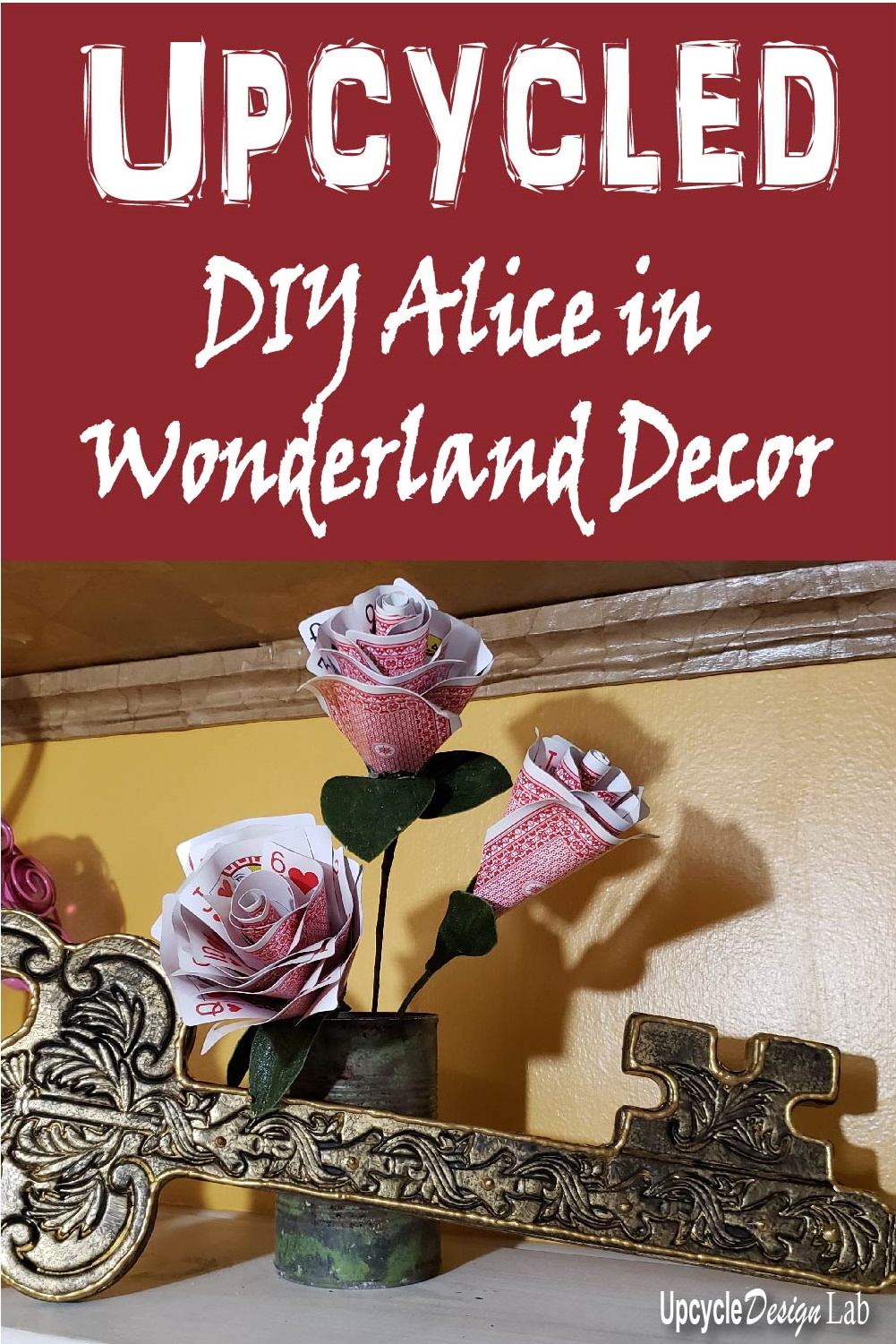 This is part one of two posts that will contain five Alice in Wonderland DIY Decor projects. Today I am sharing the first two projects, a re-purposed giant key and some roses made from a deck of cards.