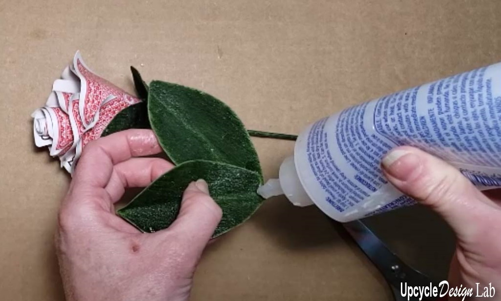 The final step is to glue on some leaves cut from scrap fabric.