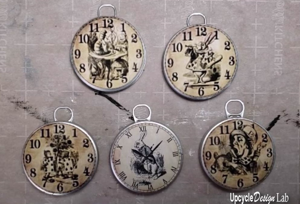 I resized some Alice in Wonderland watch face art to fit my containers and then glued it to the lids.