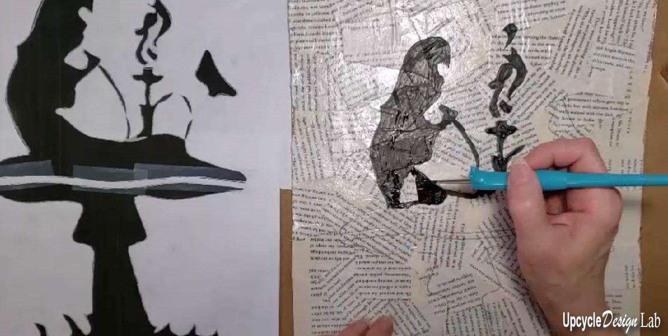 For my background I used scraps of old book paper that were glued with mod podge. Then the art was transferred to my art board and and painted with black craft paint.