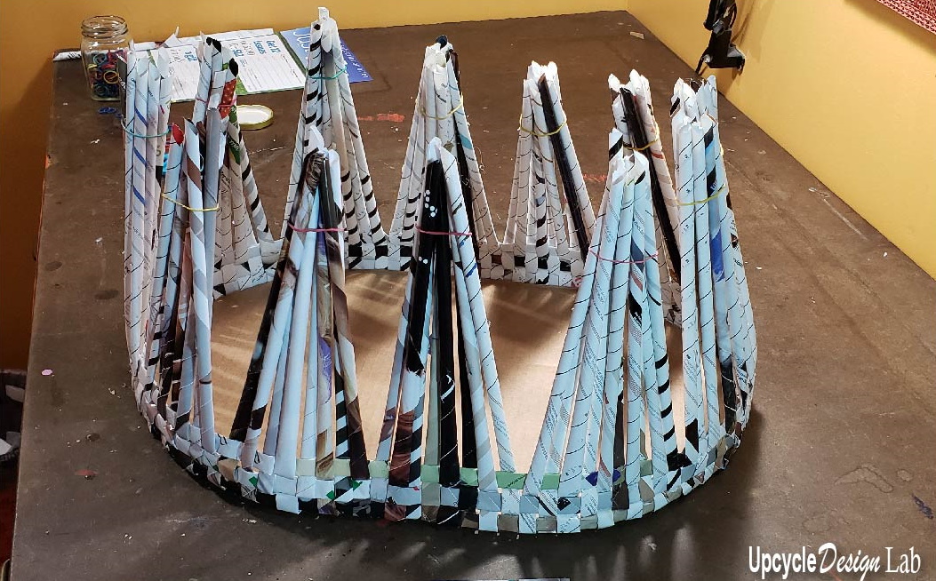 The magazine paper is rolled into tubes to be used to make the vertical and the horizontal rows of the weave which is held together with the hot glue. The process starts out in a very unruly mess but as the weaving progresses the shape becomes easier to work with. I also used some rubber bands to hold the paper tubes out of the way.