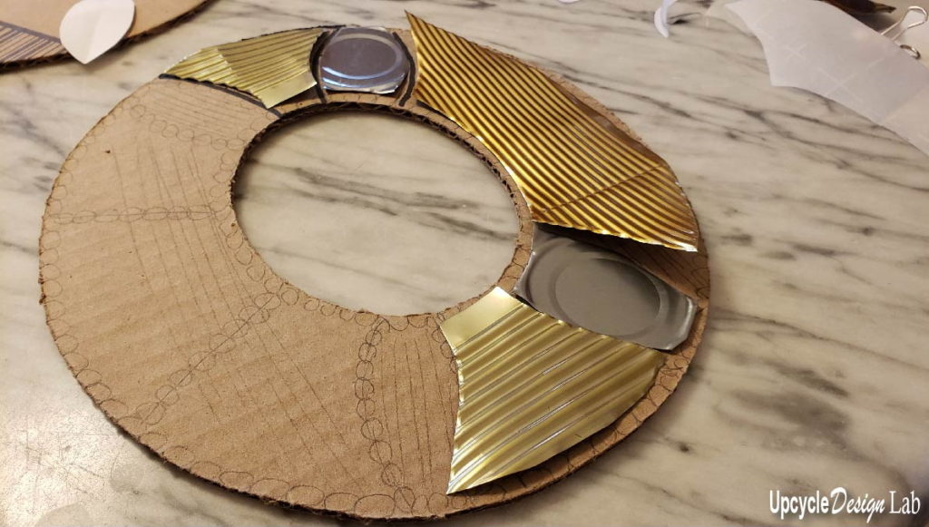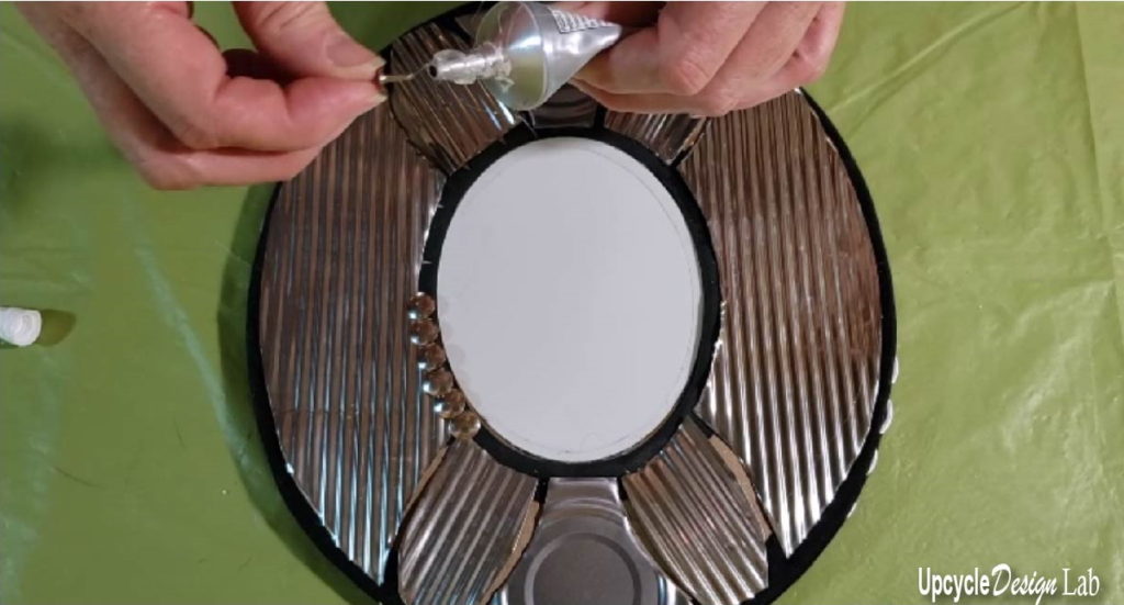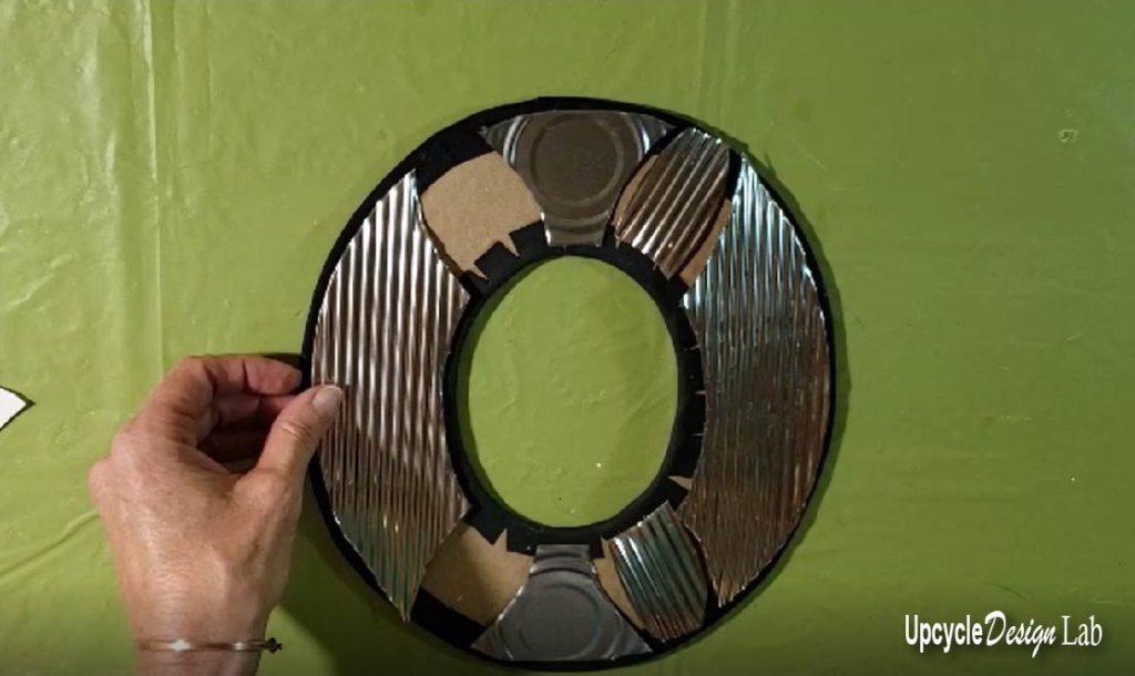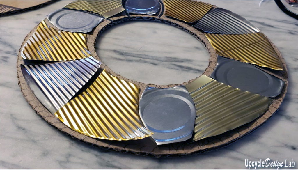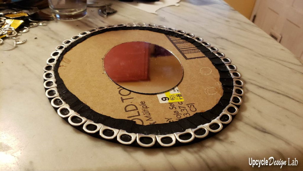 I glued some pull tabs around the edge of the cardboard frame back piece to add some detail to the edge and attached the mirror to the cardboard.