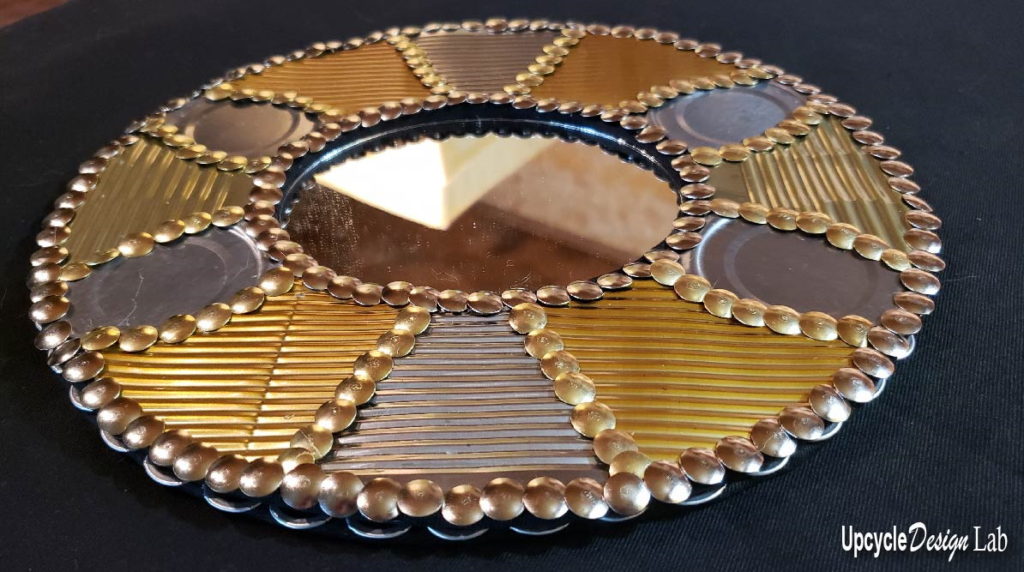 The final step is to glue thumb tacks around all the raw edges of tin cans and add a cord to the back for hanging up the mirror.