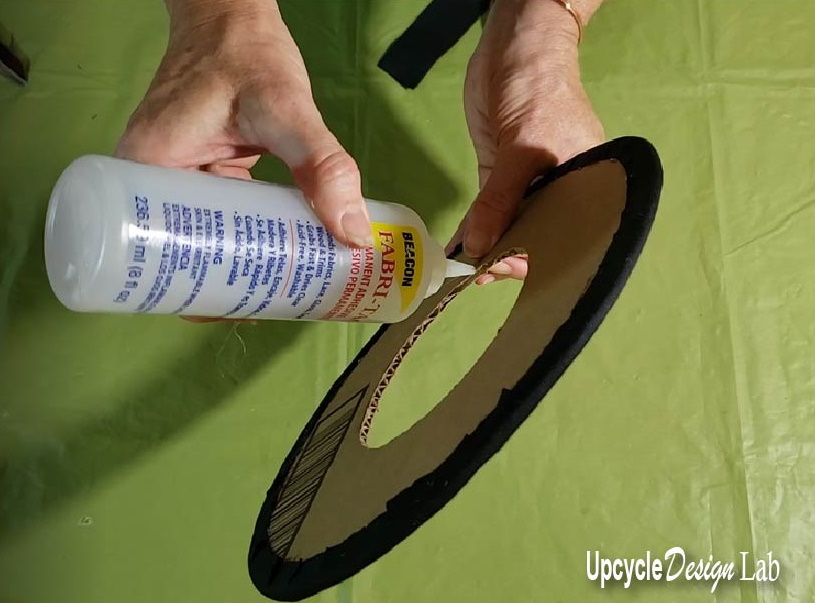 I used some scraps of fabric to cover the edges of the “doughnut-shaped” piece of cardboard and a bigger piece of fabric to cover one side of the solid piece of cardboard.