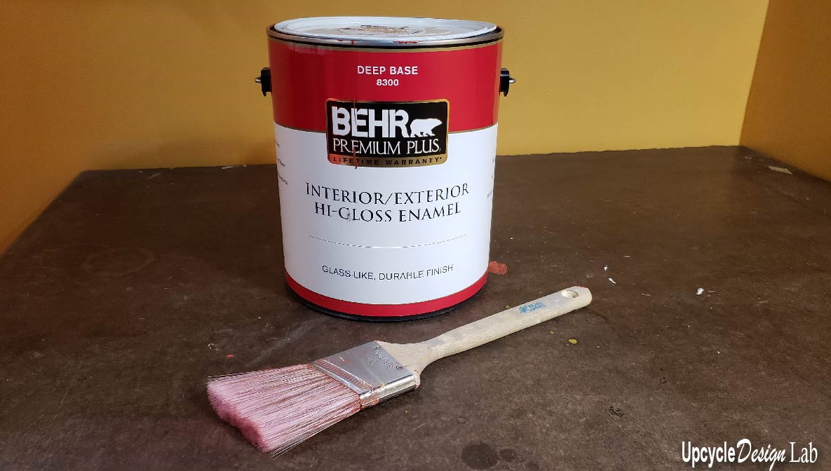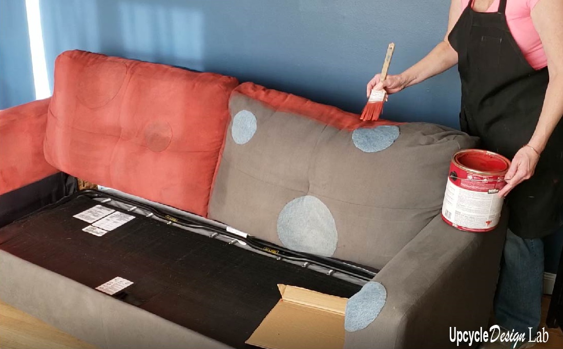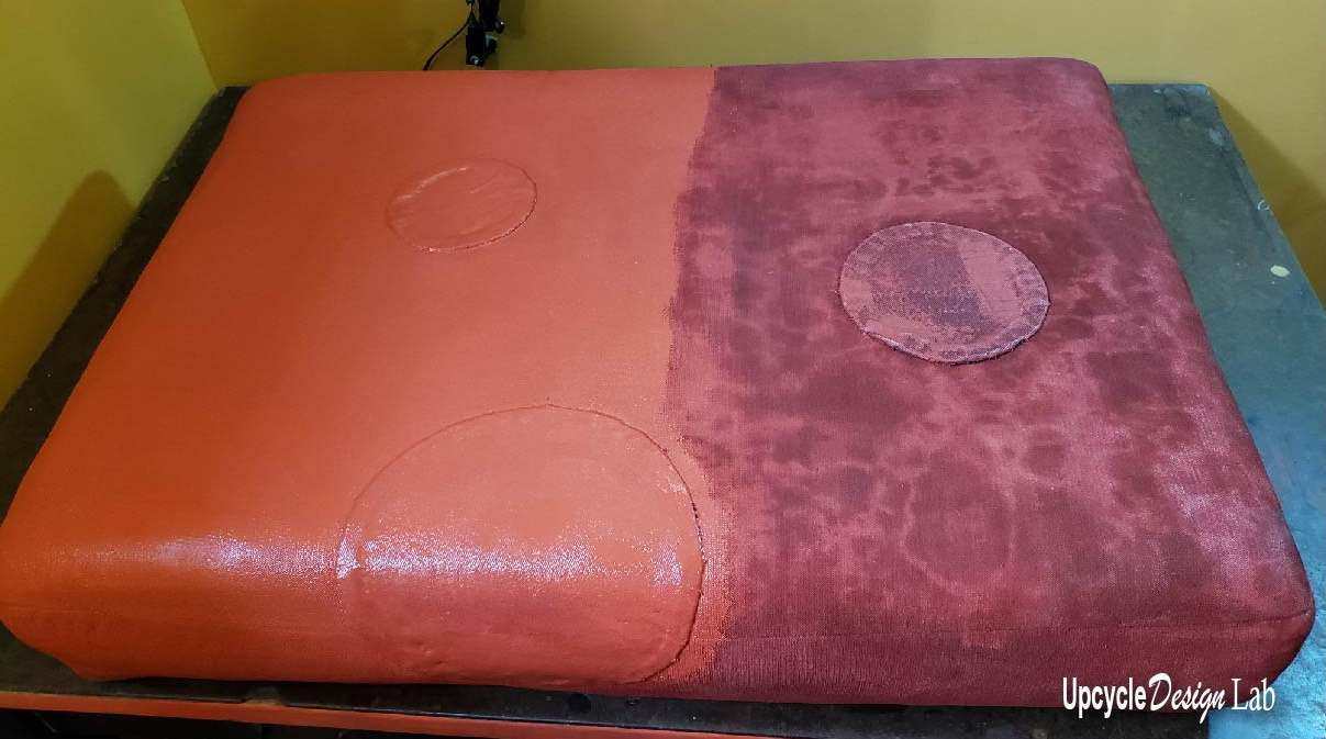 Next, it was time for the scary part. I watched many videos on painting upholstery, and everyone seems to recommend using chalk paint. But I didn’t have any chalk paint, but I did have this red high gloss house paint, so after a bit of testing, I decided just to use what I had.