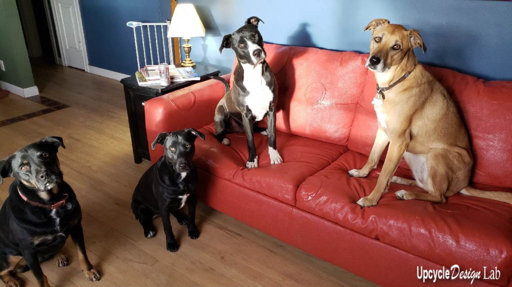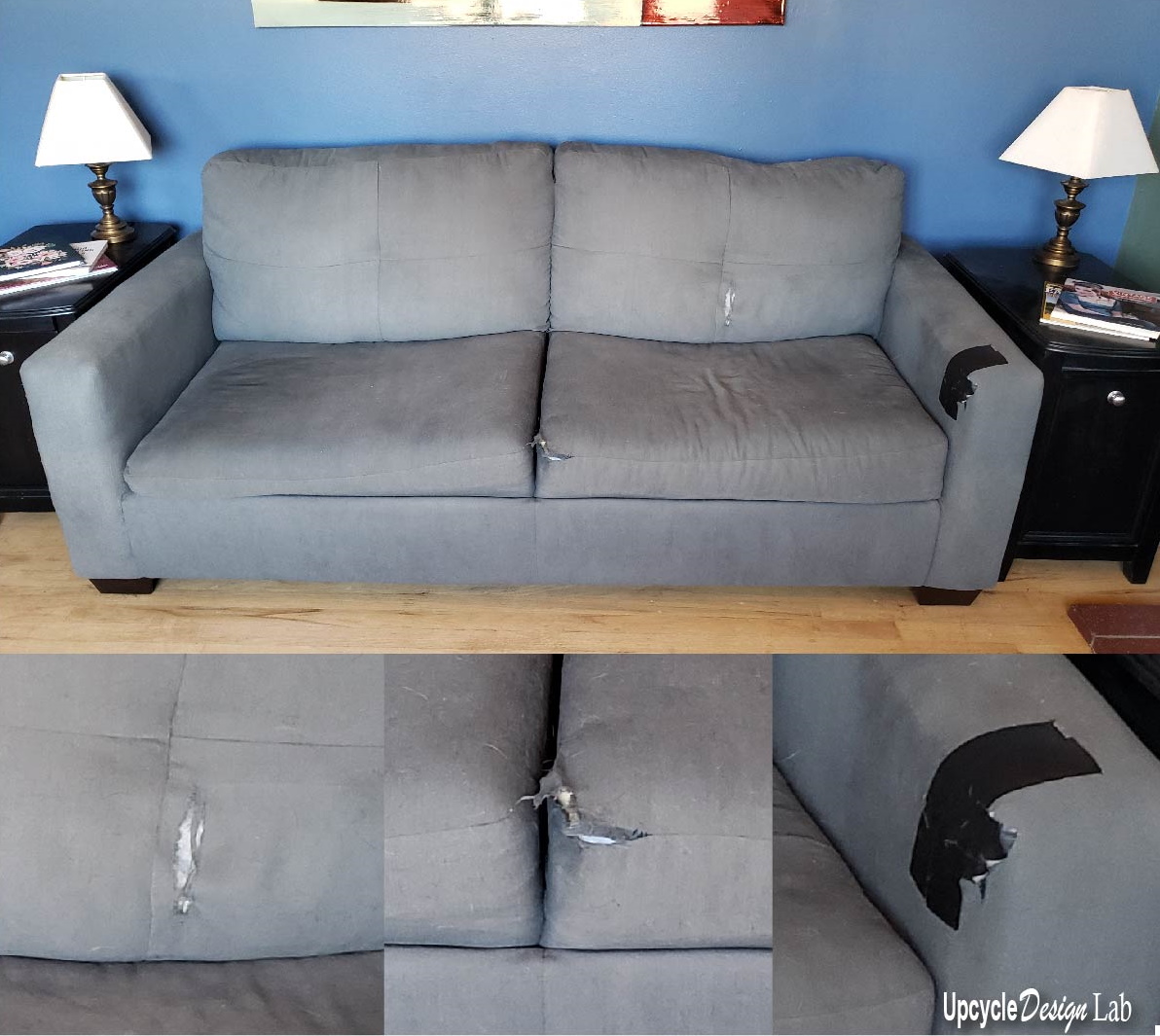 So here is my lovely couch. As you can see, there is quite a bit of damage, and you may not be able to see this, but it is also covered with quite a bit of dog and cat hair. All this damage did not happen overnight. So you might be wondering why I let it get so bad before trying to repair it, and the short answer is that I have kind of always hated it. It’s my fault. I picked it out. But the minute it was in our home, it looked terrible. The color was wrong, and it was too puffy. So when it started getting beat up by the dogs and cats, I told myself I didn’t care. But I have some pride, and the couch condition has finally reached its tipping point. So it must either be repaired or tossed out.