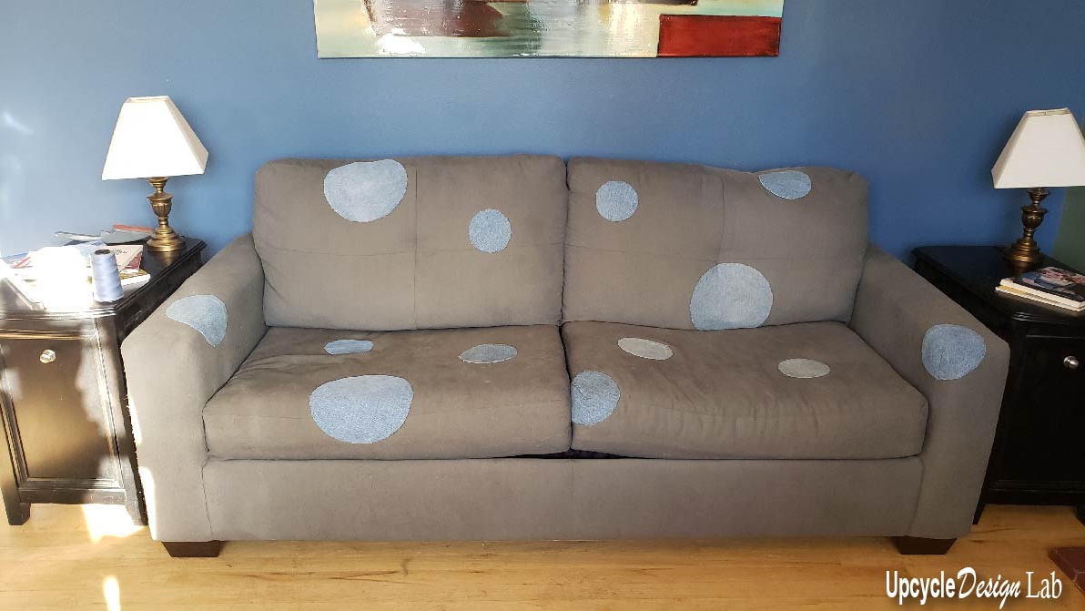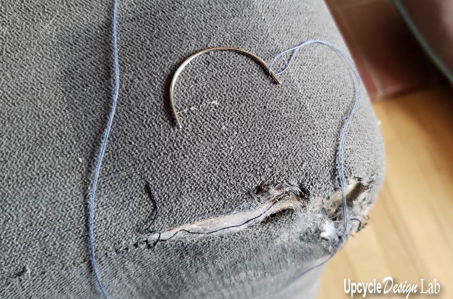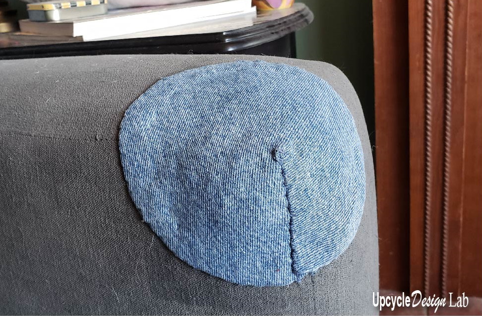 I use a curved upholstery needle to sew the patches to the couch and some Mod Podge to add more stability.