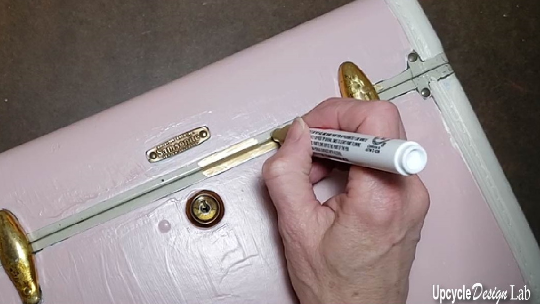Some of the hardware was also in pretty bad shape. To add a brighter finish to the metal parts I used a Craft Smart gold paint pen to cover the old beat-up finish. I wasn’t sure how well it would work but one coat covered up the rusted beat-up metal.