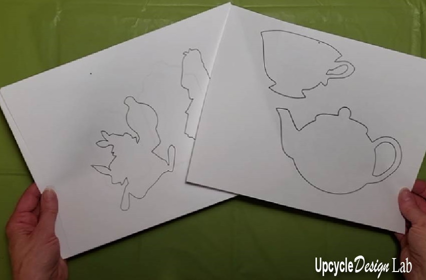 I also wanted to upgrade the tags that I use to identify what is in the cases and since I have an Alice in Wonderland theme going I decided to make the tags in character silhouette shapes. I found some silhouettes on-line and printed them out on my computer. I use Adobe Illustrator to re-size and manipulate the shapes to the sizes I wanted, but I think most graphic programs would work for this purpose.