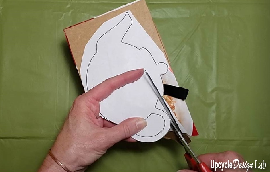 Once I had the shapes printed out I used some clean release tape to attach them to a piece of chipboard (cereal or cracker box because we are upcycling here after all). I wanted to make my tags extra sturdy so I cut out two pieces of the same shape and then used a glue stick to hold them together. Before gluing the two pieces I put a loop of fabric between the two pieces to hang the tag from.