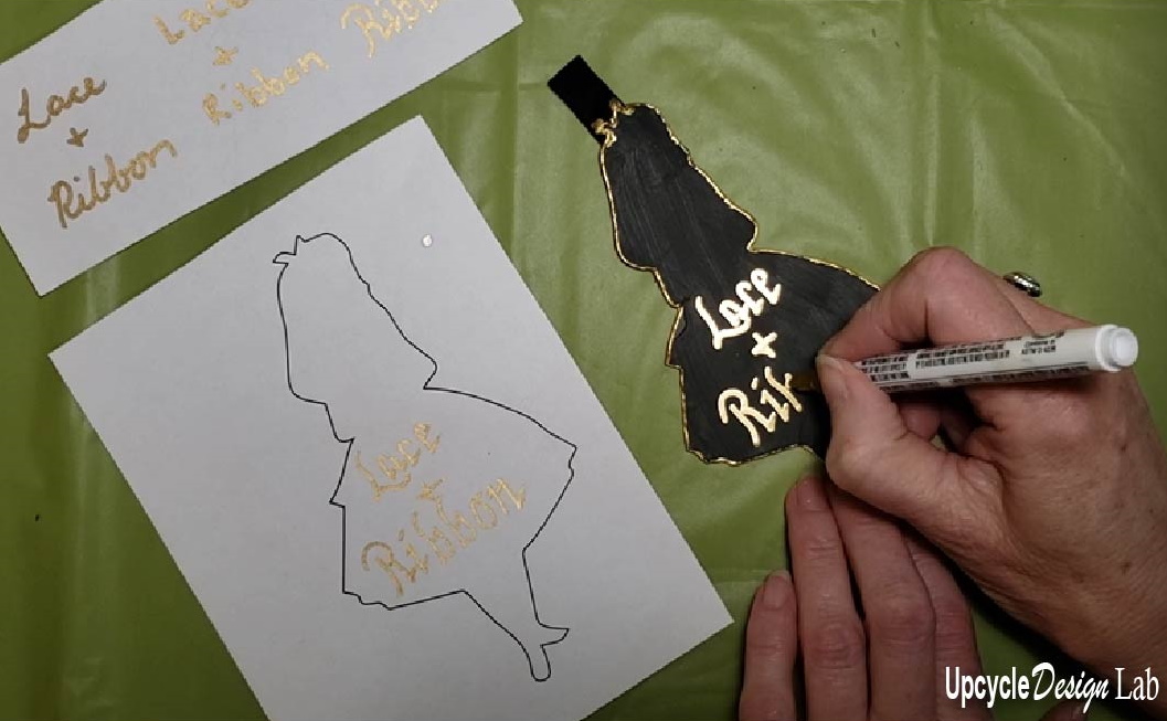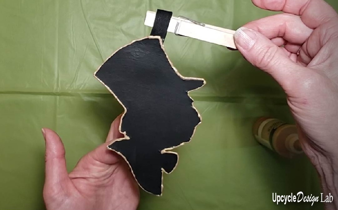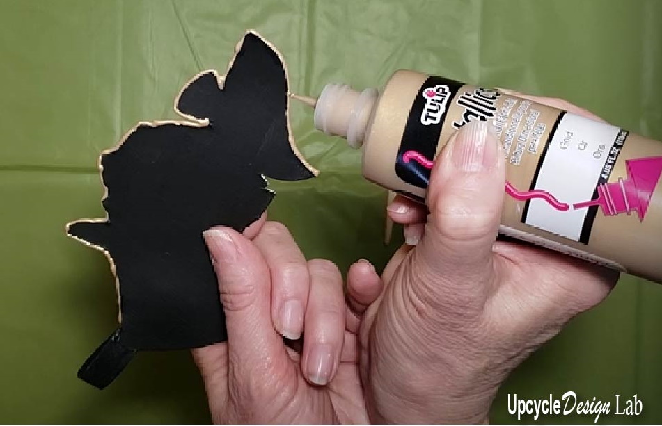 Since I was using silhouette shapes it only made sense to paint the tags black, but I wanted to add some kind of edging. Fortunately, I had some gold metallic dimensional paint made by Tulip that seemed to be perfect for the job. The bottle has a very pointed tip to squeeze the paint out of and this worked well to add the edging to my tags.