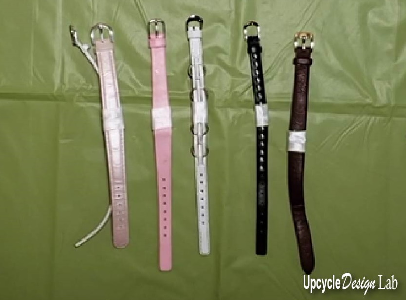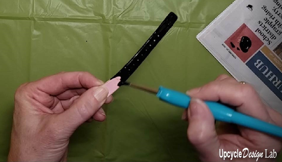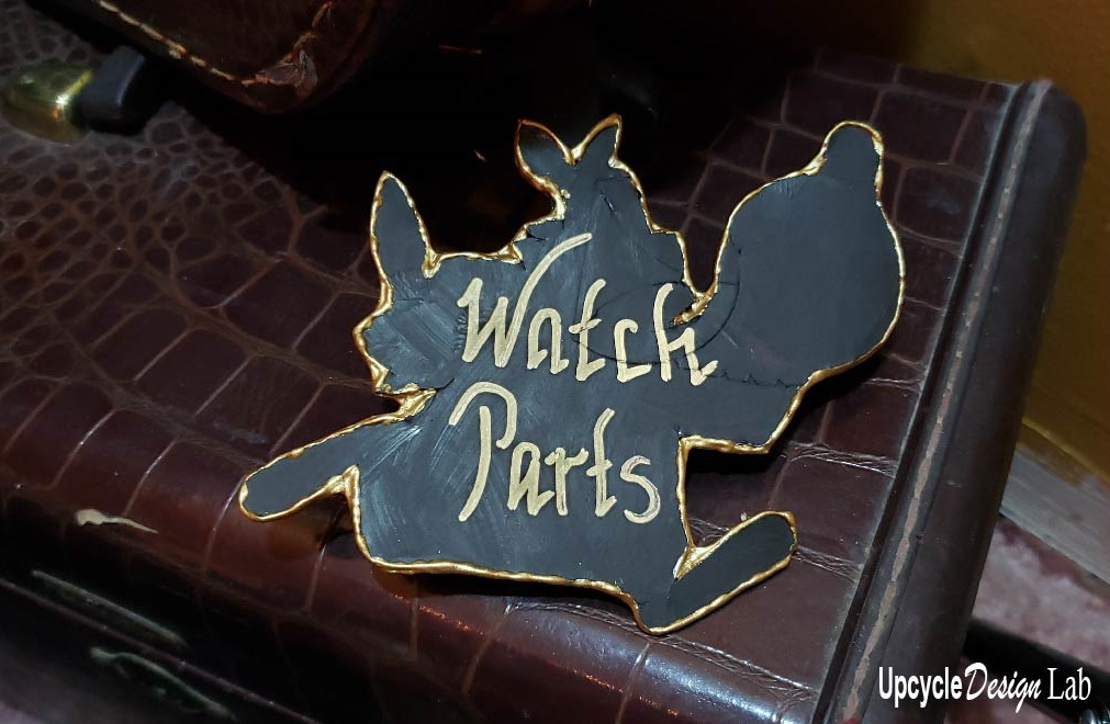 To attach the tags to the luggage I used some old watch straps. I have made a lot of projects with watch parts over the years including watch face earrings, watch picture charm bracelets and buckle earrings but to date, I had never had a use for the bands themselves. But since I never throw anything away. Ok, that isn’t entirely true. Anyway, I did still have quite a few leather watch bands and they were the perfect thing to use for my new tags. I simply glued the two band pieces together and then added a small piece of fabric for more stability around the seam. Once the glue was dry I used some more black craft paint to make the bands match my labels.